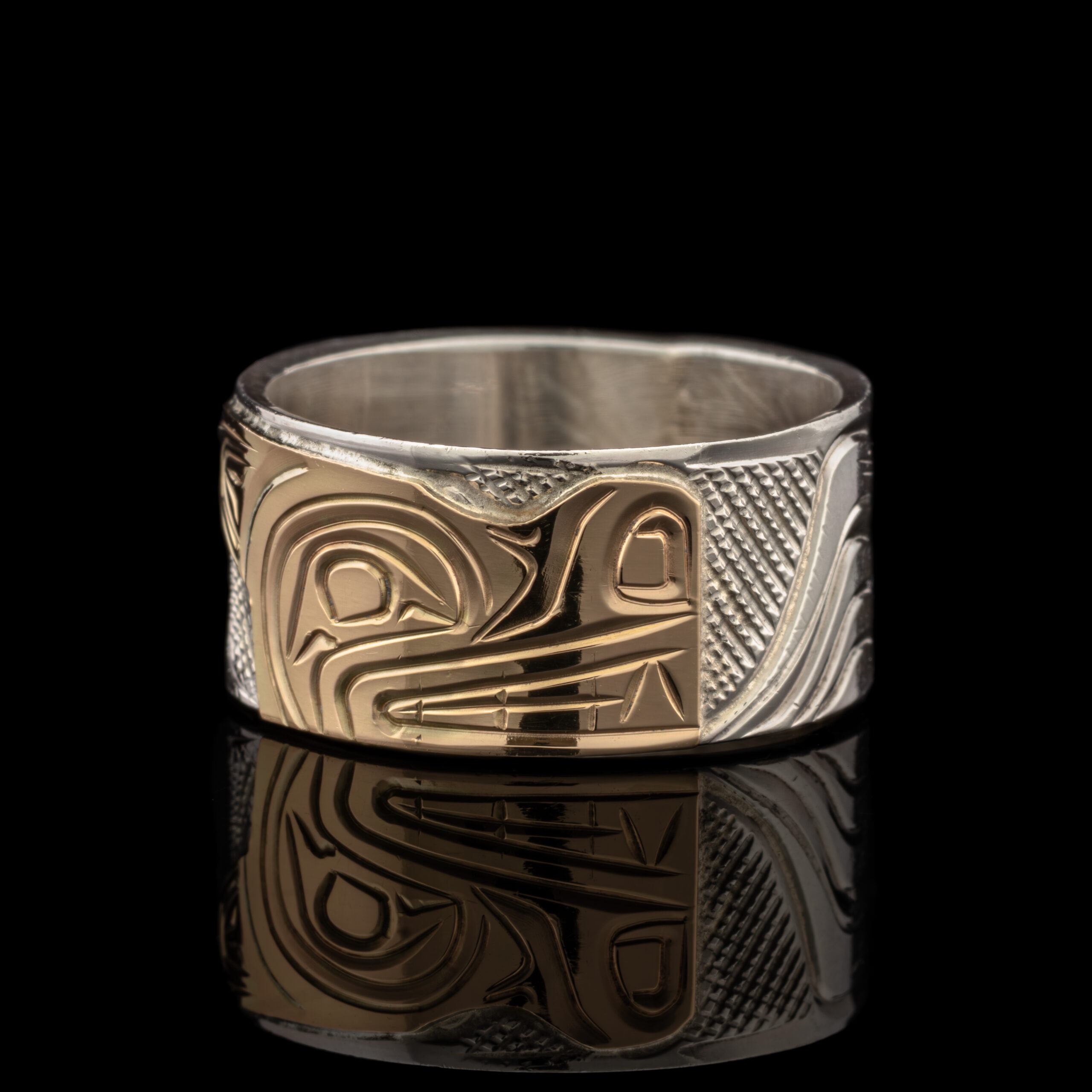 Design: Native American sterling silver band with gold plated and engraved eagle motif, Master of the Skies