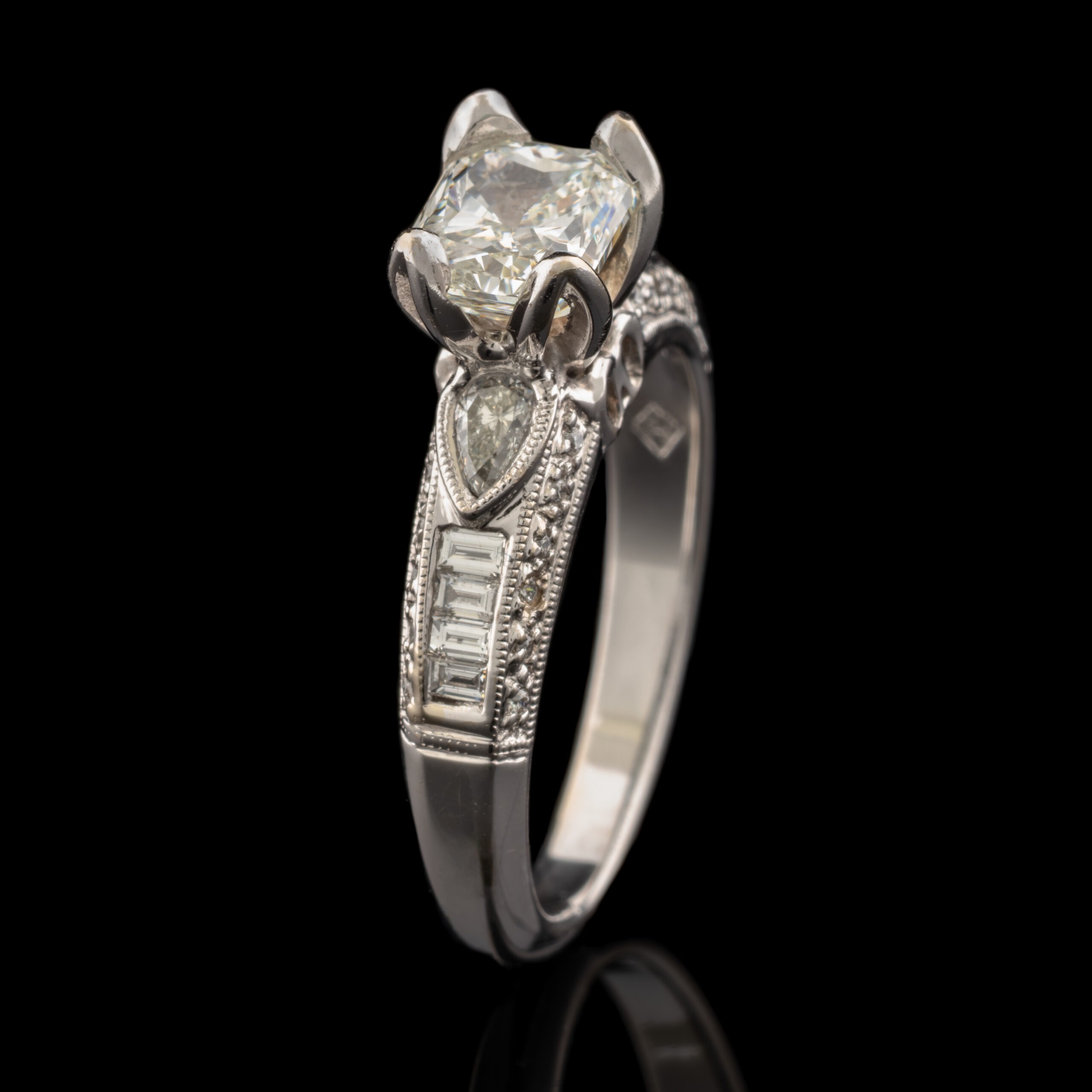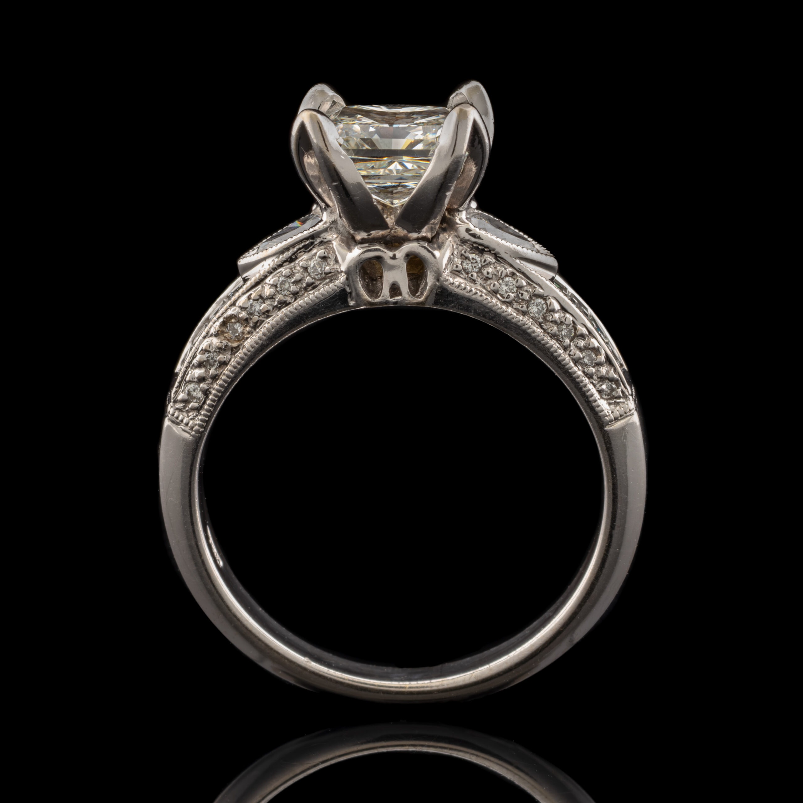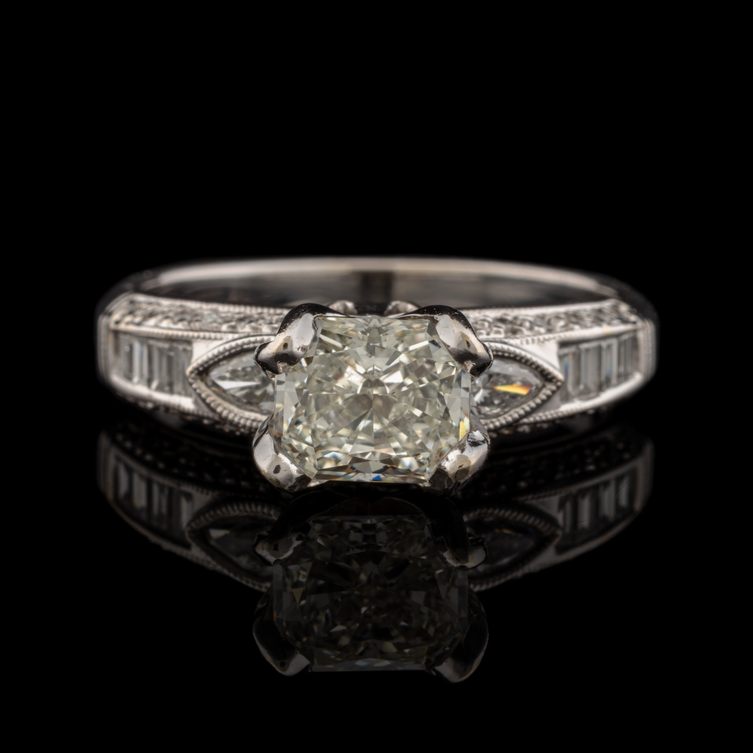 Mounting: Diamonds are set in 18K white gold setting. Radiant diamond prong set,