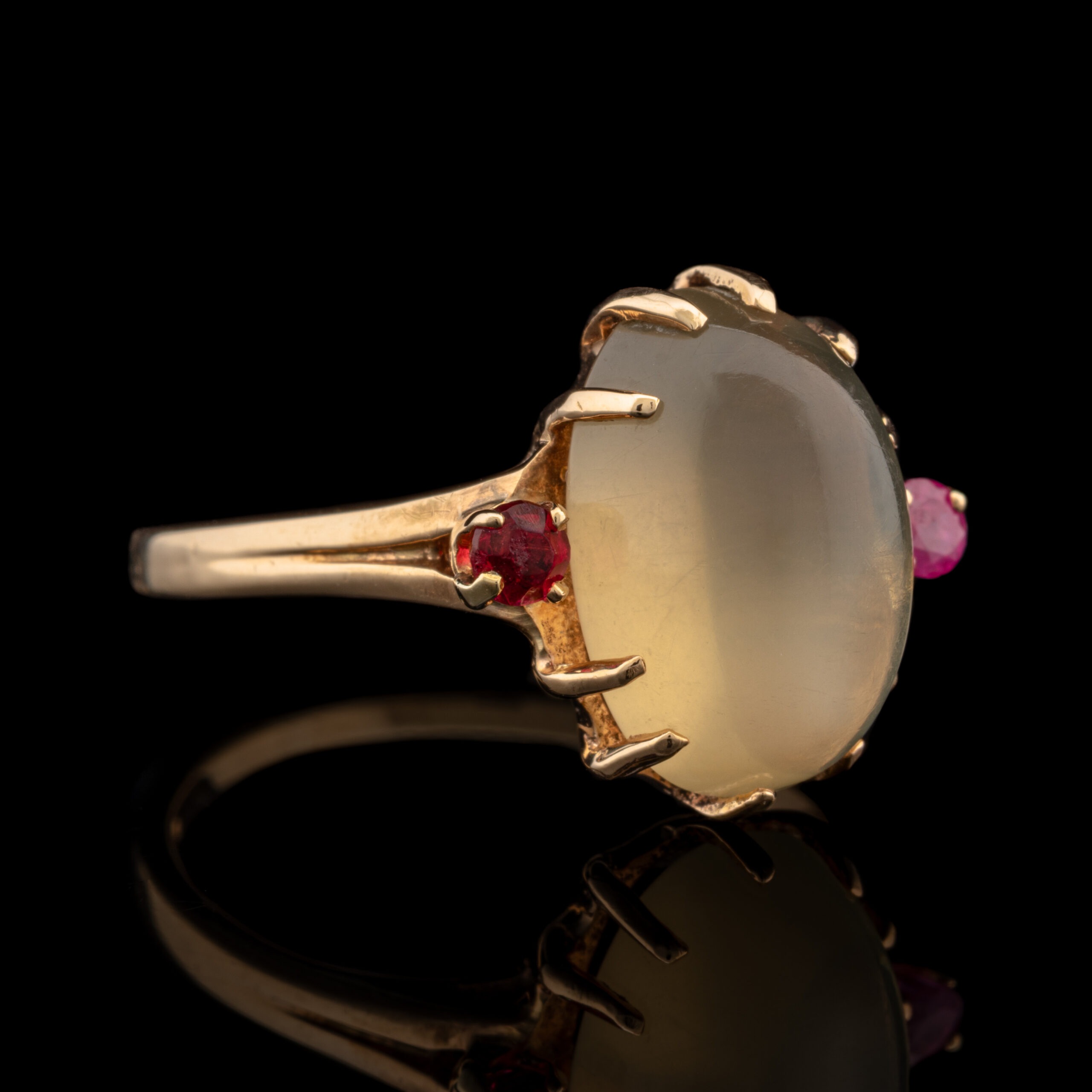 Mounting: 14K yellow gold, 10 handmade prongs holding moonstone; 4 prongs